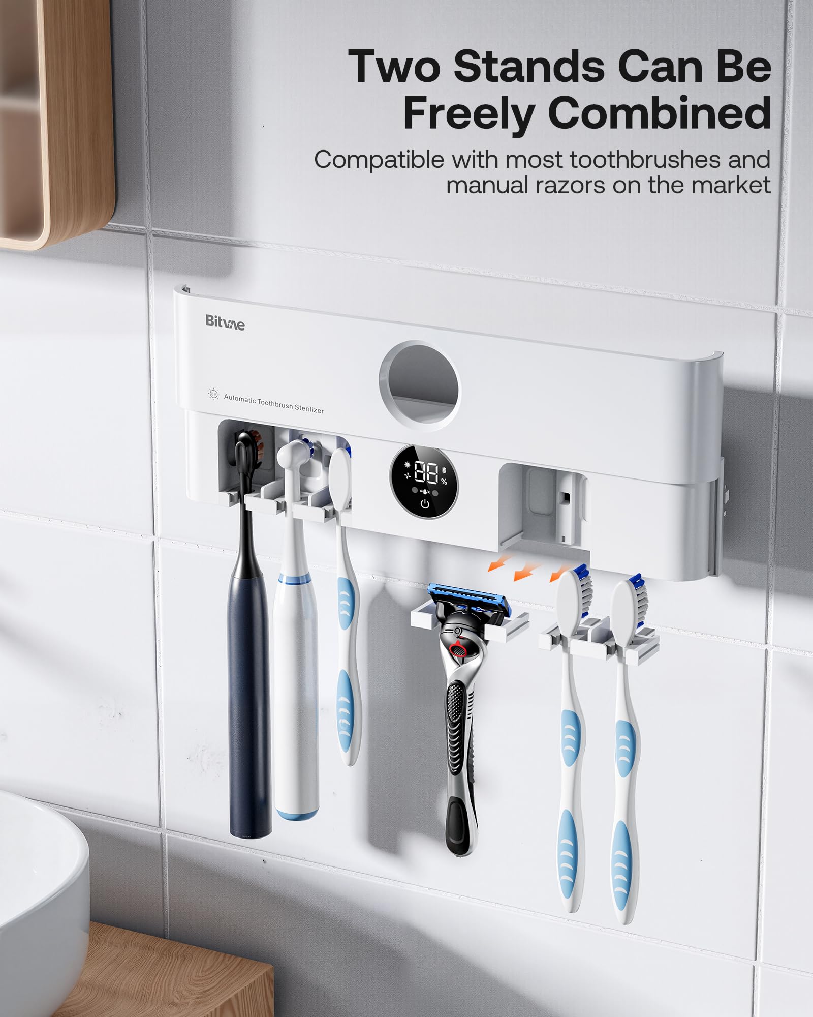 • Compatible with Most Toothbrushes: Two separate toothbrush slots for manual toothbrushes, sonic toothbrushes, rotary toothbrushes, and most slim handle brush head toothbrushes