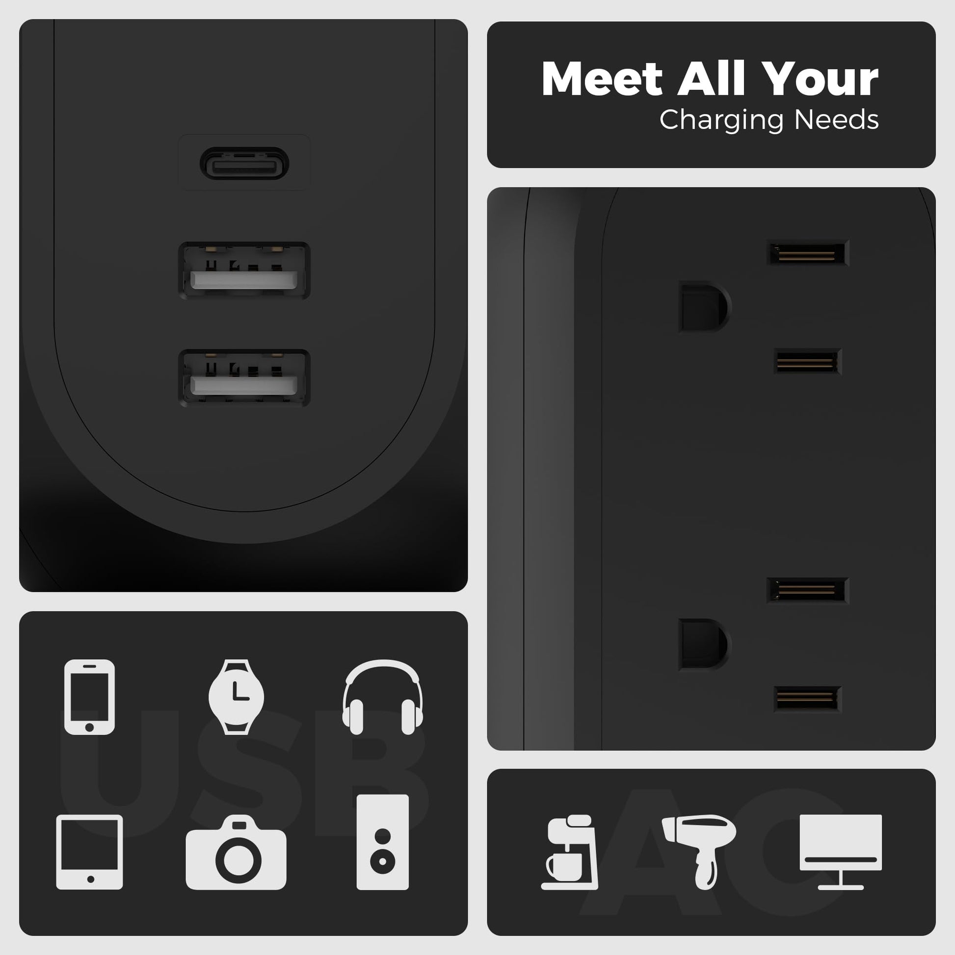 • Power Strip With USB C Ports: Dual USB A ports features 2.4A, the USB C port features 3A; 2 types of USB ports can detect charged devices and deliver optimal charging speed, giving you more charging options; Ideal for USB devices like cell phone, tablet, earphone, etc